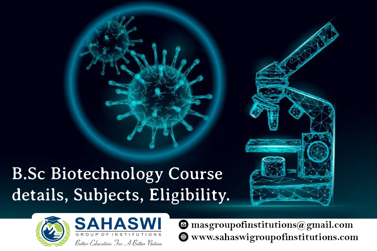 B.Sc Biotechnology / B.Sc Biotechnology course / B.Sc Biotechnology Degree/ B.Sc Biotechnology Eligibility/ Scope of B.Sc Biotechnology/ Salary of B.Sc Biotechnology/ Importance of studying B.Sc Biotechnology/ Subject involved in B.Sc Biotechnology course/ Benefits of taking B.Sc Biotechnology/B.Sc Biotechnology in Online Education/ Career opportunities for B.Sc Biotechnology graduate/B.Sc Biotechnology in distance education / B.Sc Biotechnology in top University India/B.Sc Biotechnology in Tamilnadu / B.Sc Biotechnology in top University Coimbatore/ B.Sc Biotechnology in online education in Coimbatore/ Higher studies after B.Sc Biotechnology course/B.Sc Biotechnology in online education in Tamilnadu / B.Sc Biotechnology in online education in India/ Advantages of B.Sc Biotechnology/ Significance of B.Sc Biotechnology. B.Sc. Biotechnology unlocks the fascinating intersection of biology and technology, offering a dynamic and future-proof career path.Duration of this course is 3 years and it completely focus on understanding and applying biological principles to develop new technologies and products in various fields like medicine, food, agriculture, environment, and more. Subjects: Core subjects: Cell Biology, Biochemistry, Genetics, Molecular Biology, Immunology, Microbiology, Bioprocess Engineering, Bioinformatics, Plant and Animal Biotechnology. Elective subjects: Depending on the university, you may choose specialized areas like recombinant DNA technology, enzyme technology, nanobiotechnology, environmental biotechnology, etc. Eligibility: Minimum qualification: Pass 10th, +2 (Senior Secondary) with Physics, Chemistry, and Biology/Mathematics as core subjects. Percentage/Marks: Varies from university to university, typically ranging from 50% to 60% aggregate in science subjects. Benefits: High demand: Biotech graduates are in high demand across diverse sectors, leading to promising career prospects and competitive salaries. Continuous learning: The rapidly evolving field keeps work intellectually stimulating and requires constant learning and adaptation. Impactful work: Contribute to advancements in healthcare, food security, environmental sustainability, and various other areas. Diverse career options: Choose from a wide range of career paths in research, development, production, quality control, marketing, and more. Sahaswi Group of Institutions is the leading institute for distance and online education in Coimbatore. All the study materials, E-materials, ID cards, Syllabus, Hall tickets, and Exam Time tables will be provided by us. You can gain proper guidance from commencing your course and placement facility till the completion of your course. Here you can get amazing distance education programs from well-reputed universities in and around India.