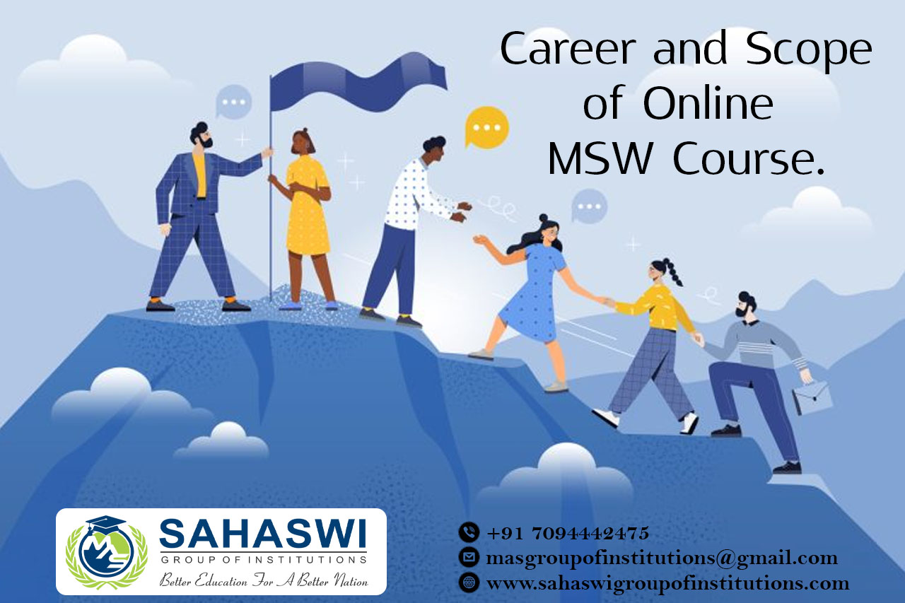Career opportunities for Online MSW graduate/ Online MSW program / MSW course / MSW Degree/ MSW Eligibility/ Scope of MSW course/ Salary of Online MSW course/ Importance of studying Online MSW course/ Subject involved in Online MSW course/ Benefits of taking Online MSW/ MSW in Online Education/ Online MSW distance education / Online MSW course in top University india/Online MSW in top University Tamilnadu / Online MSW course in top University Coimbatore / Online MSW course in online education in Coimbatore / MSW course in online education in Tamilnadu / MSW course in online education in India. The career and scope of an Online MSW (Master of Social Work) course are both expansive and rewarding. This program prepares graduates for a variety of roles in the field of social work, enabling them to make a positive impact on individuals, families, and communities. Here's an overview of the career opportunities and scope for individuals who complete an Online MSW: → Clinical Social Worker → Medical Social Worker → School Social Worker → Child and Family Social Worker → Geriatric Social Worker → Mental Health Counselor → Substance Abuse Counselor → Community Organizer → Nonprofit Leadership → Policy Analyst/Advocate → Forensic Social Worker → Private Practice → Academia and Research → International Social Work The scope for Online MSW graduates is diverse, with opportunities in various settings, including hospitals, schools, government agencies, nonprofit organizations, and private practice. Social workers play a vital role in promoting social justice, advocating for marginalized populations, and improving the overall well-being of individuals and communities. The demand for social workers continues to grow, making an Online MSW a valuable and impactful degree choice. Here at Sahaswi Group of Institutions, you can find all types of UG, PG, Diploma, PG Diploma, and certificate programs in the distance and online education modes. Enrolling in distance or online education courses via the Sahaswi Group of Institutions, you can get UGC-approved degree certificates along with A+ grade mark sheets from your enrolled University. Also, we provide the students with exclusive online courses, live sessions, and other educational benefits.